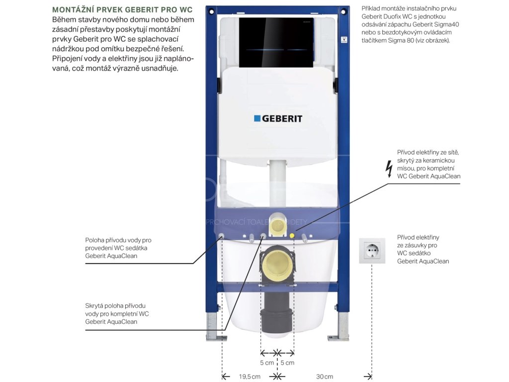 - Elektrické připojení k síti s trojžilovým pružným opláštěným kabelem, po straně vpravo skryté za WC keramikou