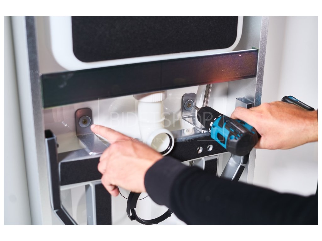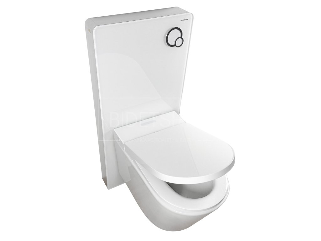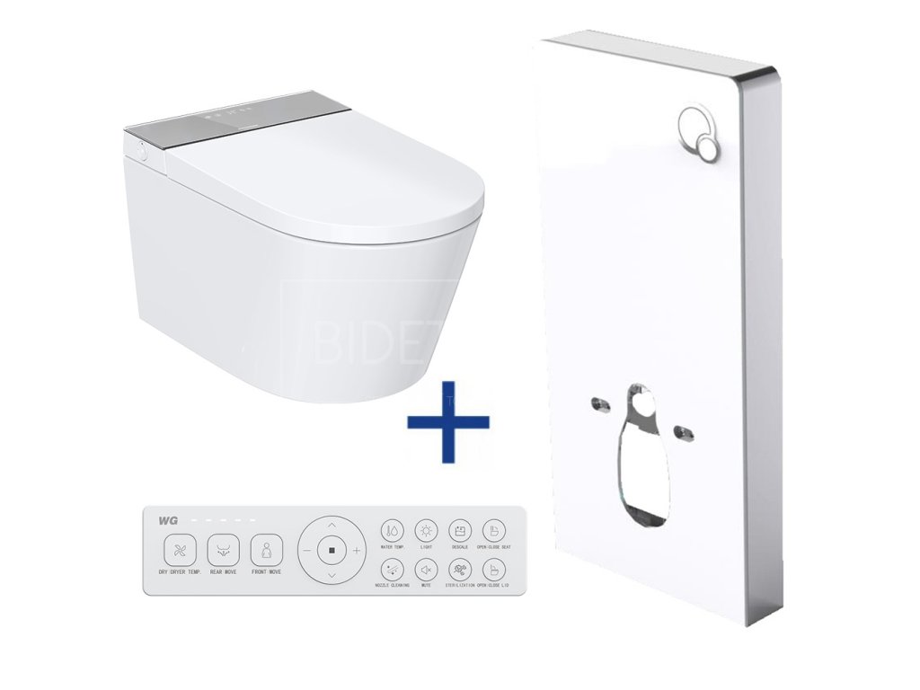 Designová elektronická sprchovací toaleta s dálkovým ovládáním zavěšená na samonosným 11 cm hlubokým WC modulu připevněným ke stěně. Nosnost 160 kg. Celková hloubka sestavy 69 cm. Rám WC modulu vyroben z vysoce kvalitního hliníku. Přední stranu tvoří 8 mm silné ESG tepelně tvrzené bezpečnostní sklo. Nádržka na vodu s plným i částečným tichým pneumatickým splachováním. Ovládací tlačítko již součástí balení.