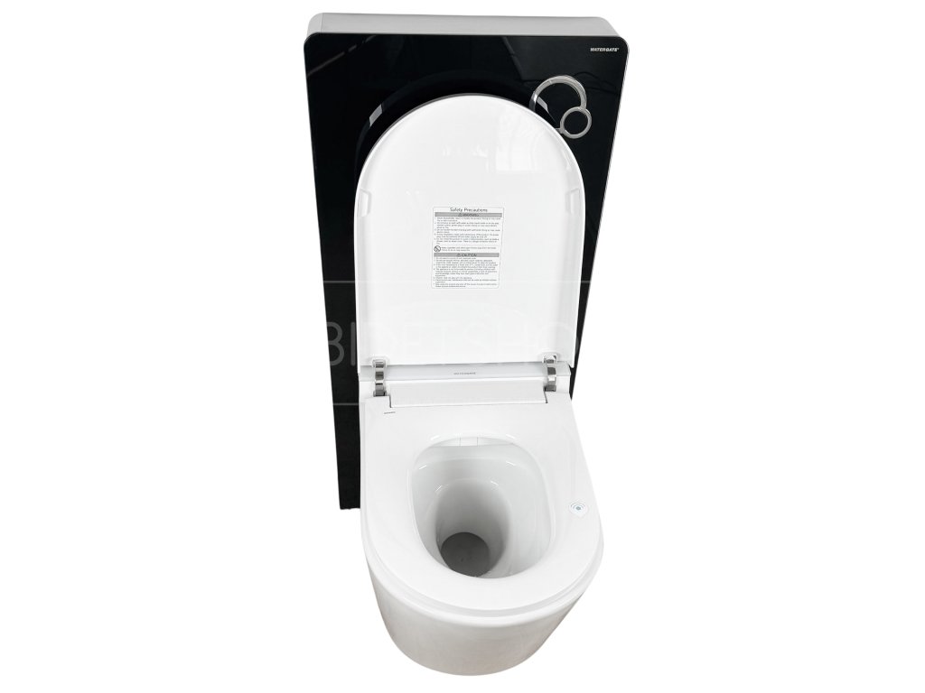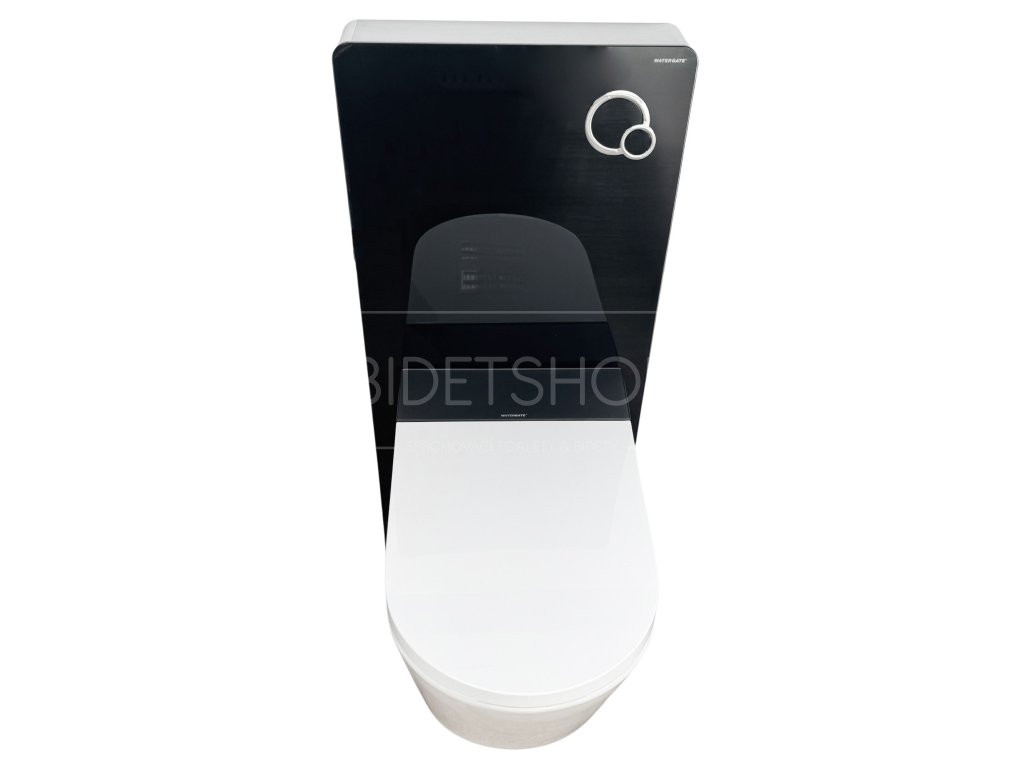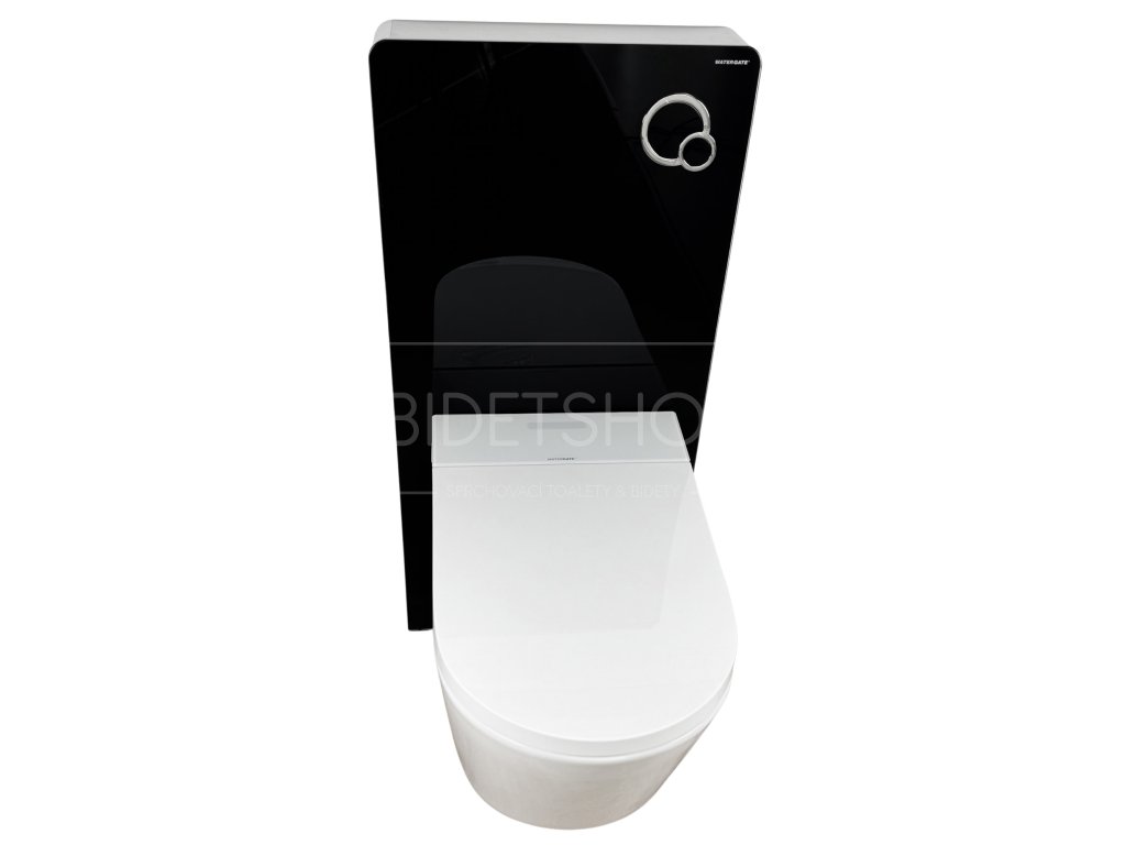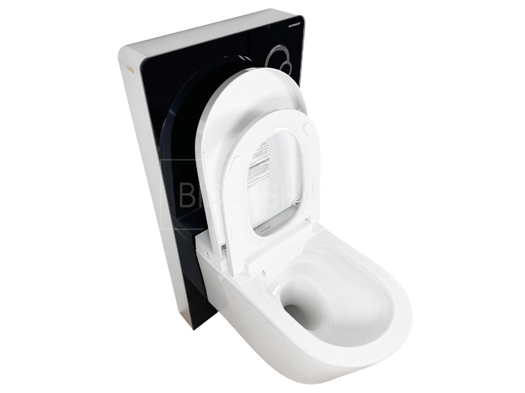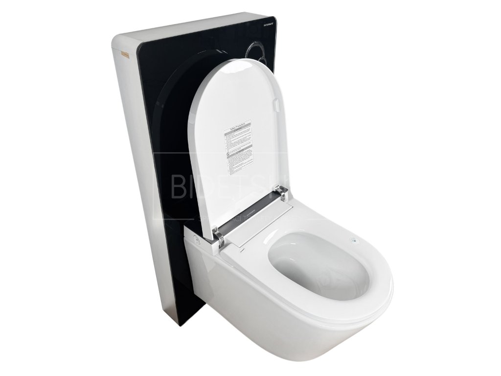 Designová elektronická sprchovací toaleta s dálkovým ovládáním zavěšená na samonosným 11 cm hlubokým WC modulu připevněným ke stěně. Nosnost 160 kg. Celková hloubka sestavy 69 cm. Rám WC modulu vyroben z vysoce kvalitního hliníku. Přední stranu tvoří 8 mm silné ESG tepelně tvrzené bezpečnostní sklo. Nádržka na vodu s plným i částečným tichým pneumatickým splachováním. Ovládací tlačítko již součástí balení.